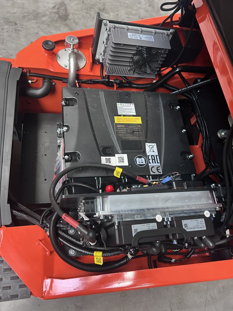 - Baterija – 76,8V ir 205Ah ličio geležies fosfatų (gamintojas – EIKTO, įkroviklis – 80V65A). Pakanka 3 – 4 gryno darbo laiko. Puikiai tinka Lietuvos klimato sąlygoms: baterijos iškrovimo (darbinė) temperatūra: -20℃- +55℃; trumpalaikio stovėjimo temperatūra: -20℃- +40℃, ilgalaikio parkavimo temperatūra: 0-25℃; įkrovimo temperatūra: 0℃- +45℃, aplinkos drėgmė 5%-80%, ilgalaikio parkavimo drėgmė ≤70%